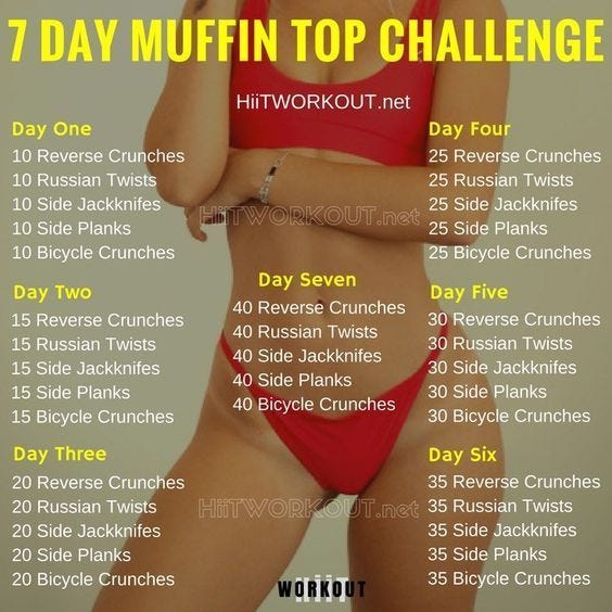 Step your left foot back to center. Day number 5 is for a rest. Your muffin top didn't appear overnight, so you shouldn't expect to lose it immediately. Eating right, combining strength training and cardio, getting enough sleep and using moves specifically designed to target your core. All the situps in the world won't reduce your waist circumference or rid you of a muffin top.